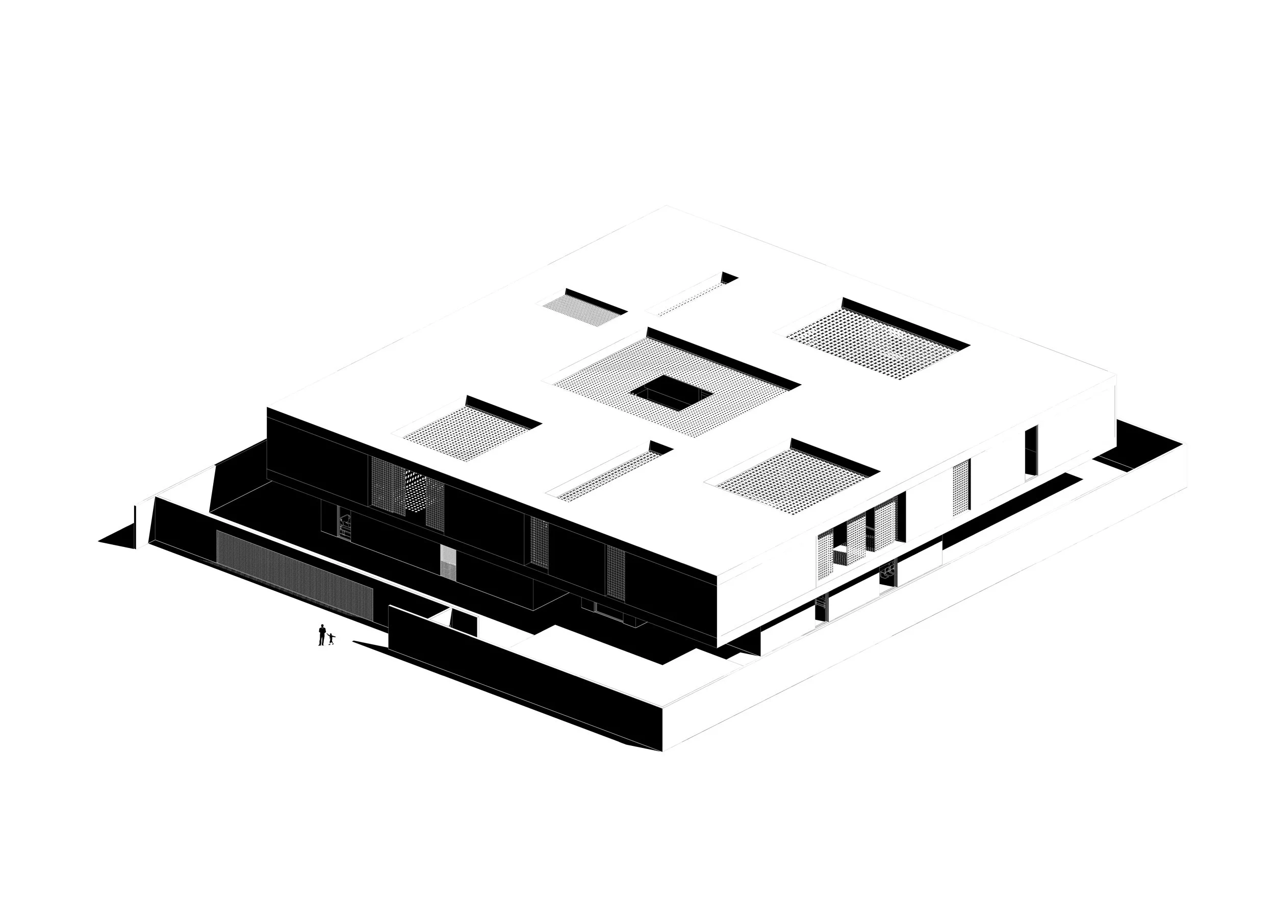 The project is conceived as a cluster of three independent family houses and a separate guest wing, all organized around a central courtyard. Each house functions as a self-sufficient unit, ensuring privacy and autonomy, while being internally oriented toward both private courtyards and the shared central space.