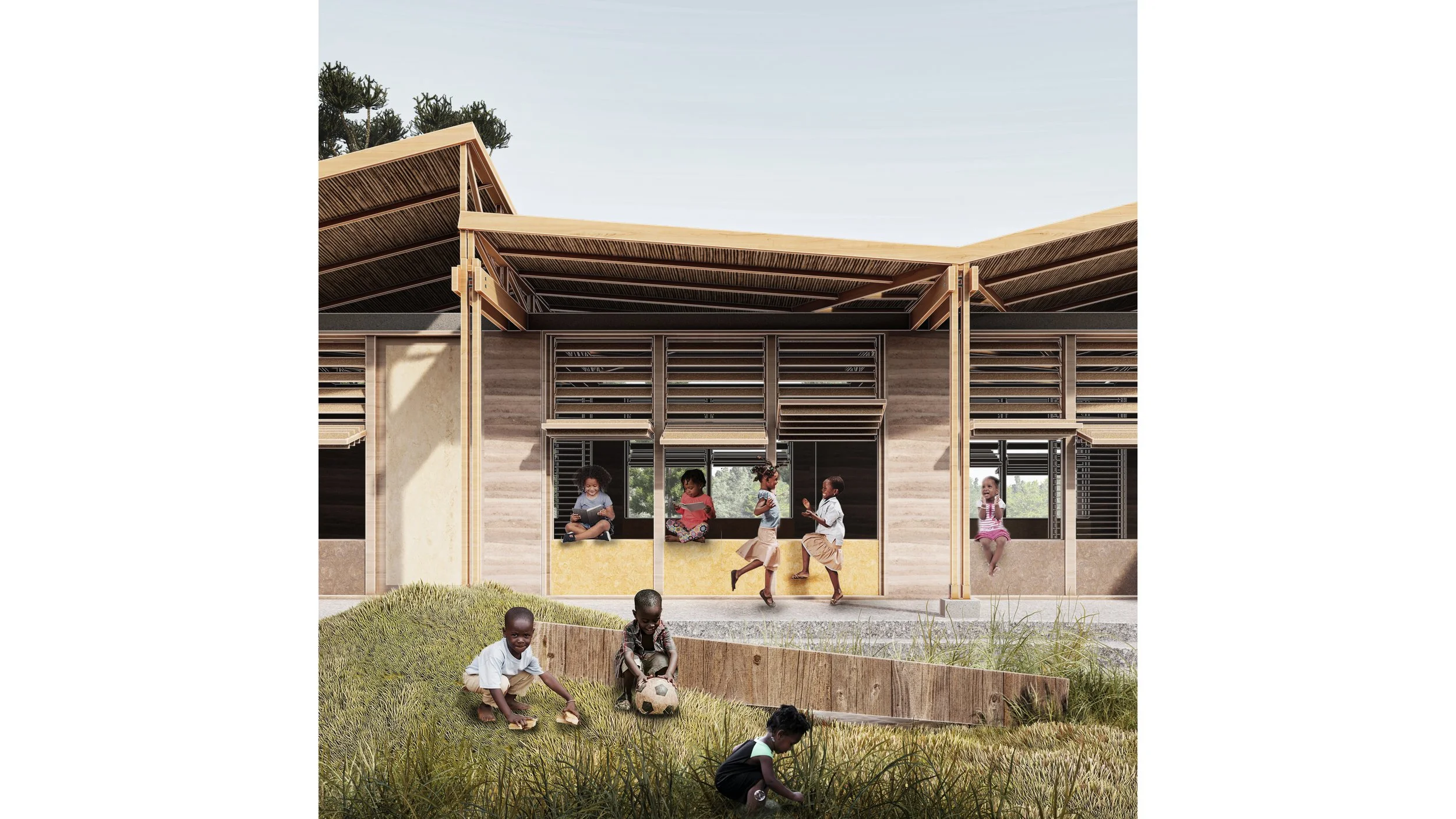 A modular system that grows with the school’s needs, built with natural, locally sourced materials such as rammed earth, wood, and metal for durability and affordability.