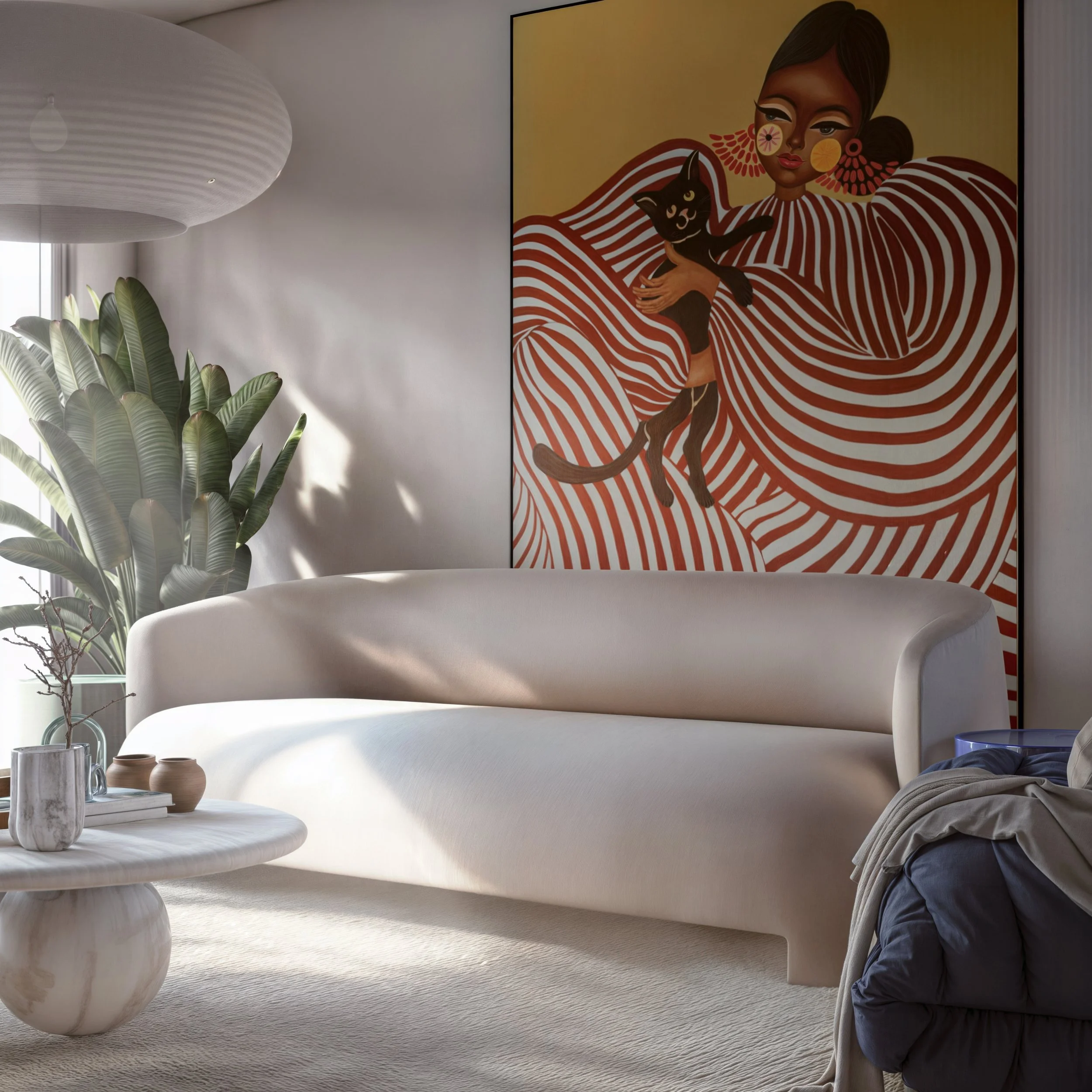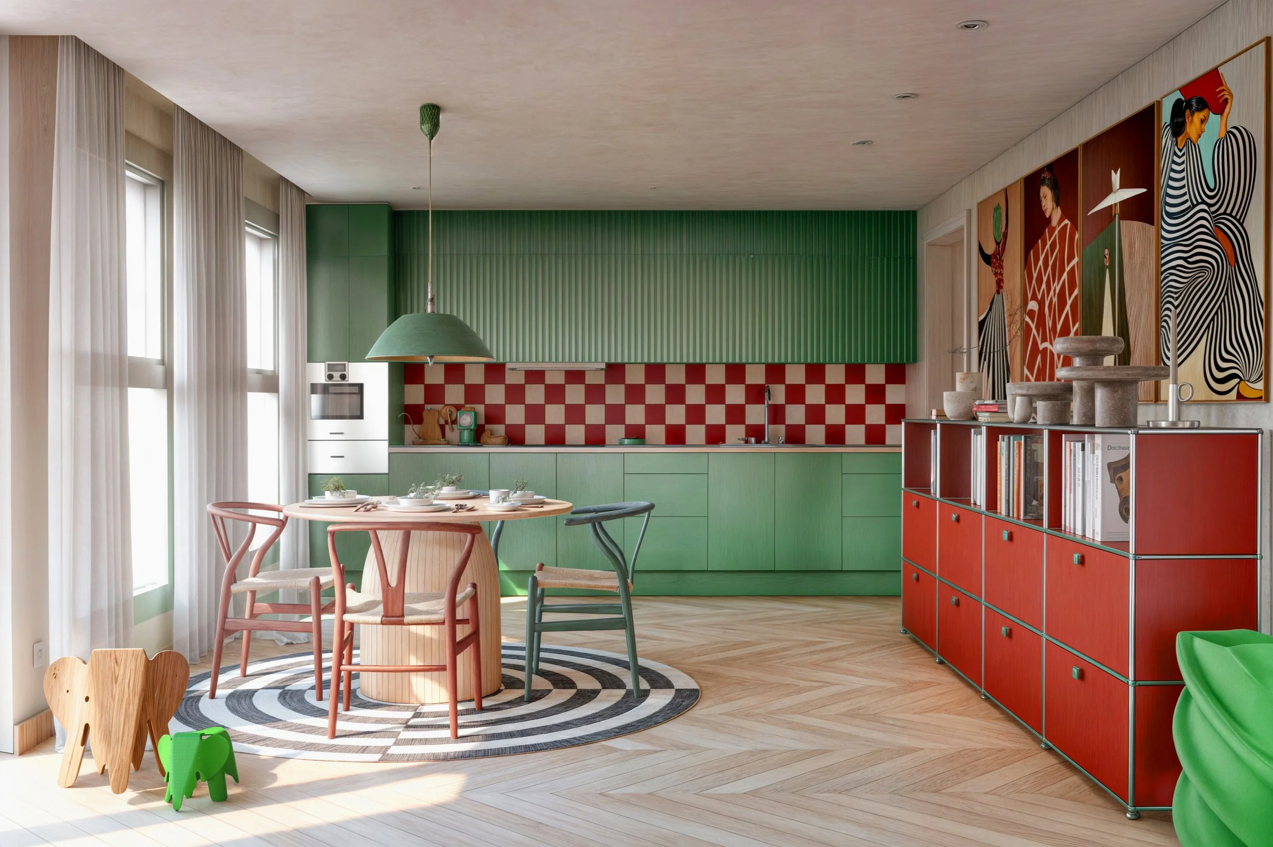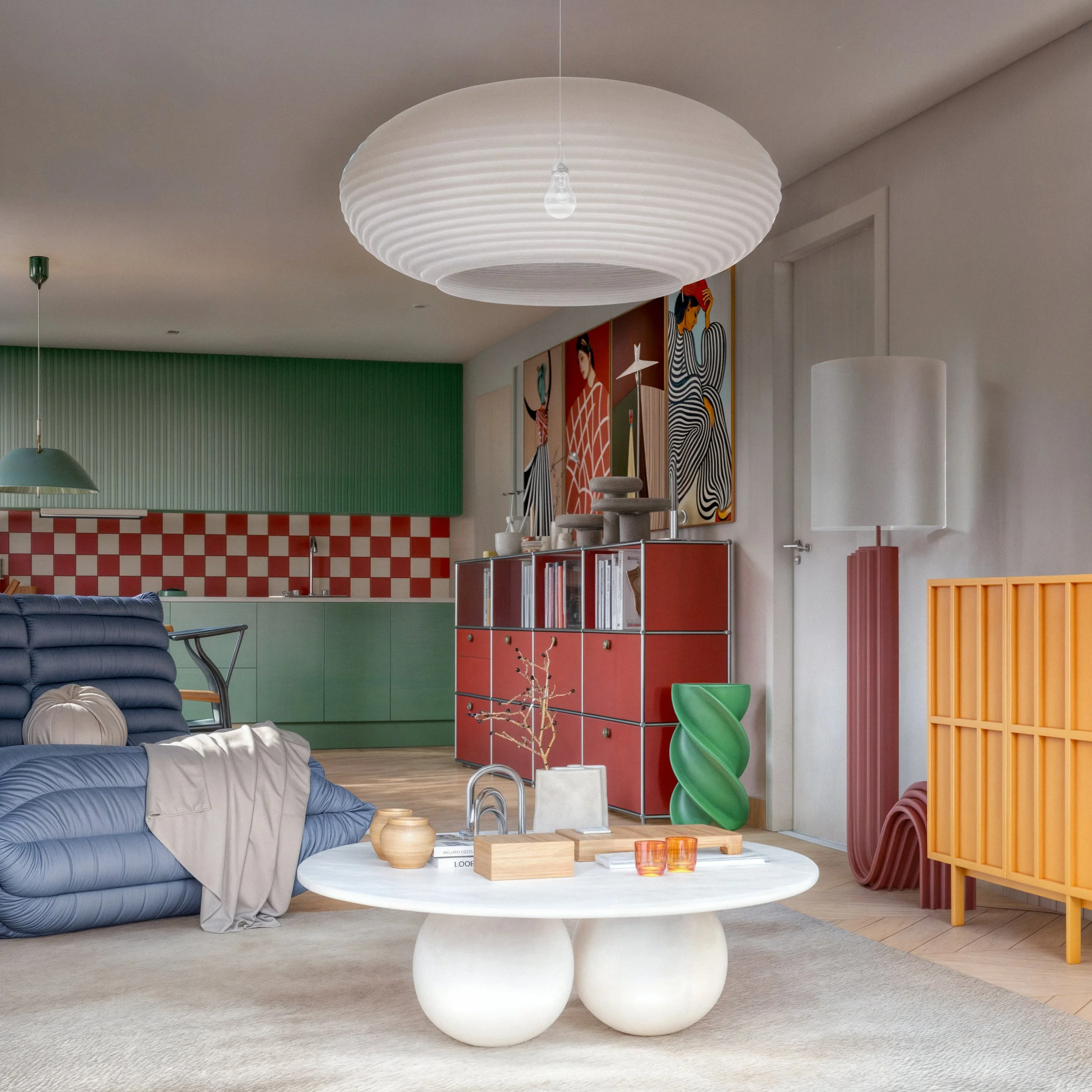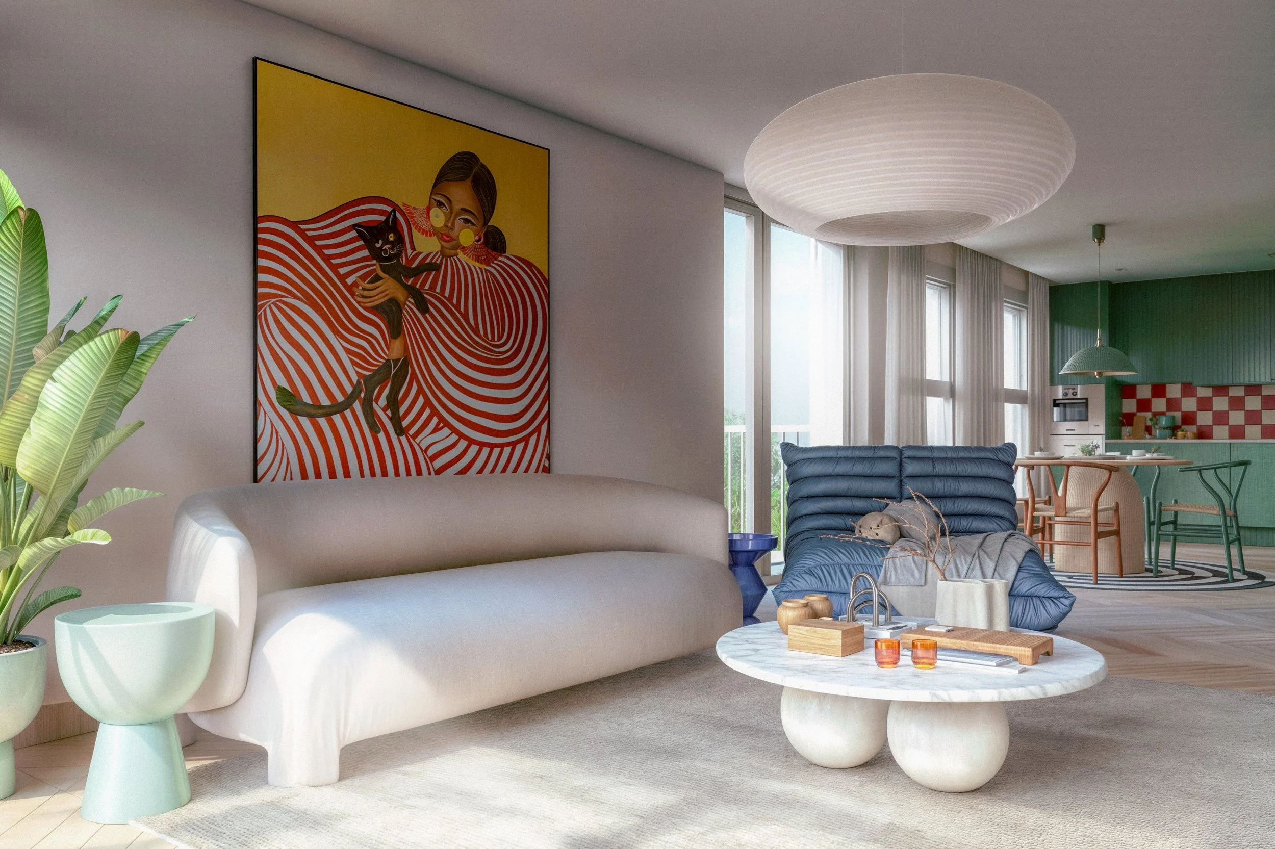 The design translates this natural rhythm into a livable interior experience: layers of color, texture, and light unfold throughout the apartment like a cultivated field. Each space is composed with intention, evoking movement and continuity while maintaining a sense of calm and order.