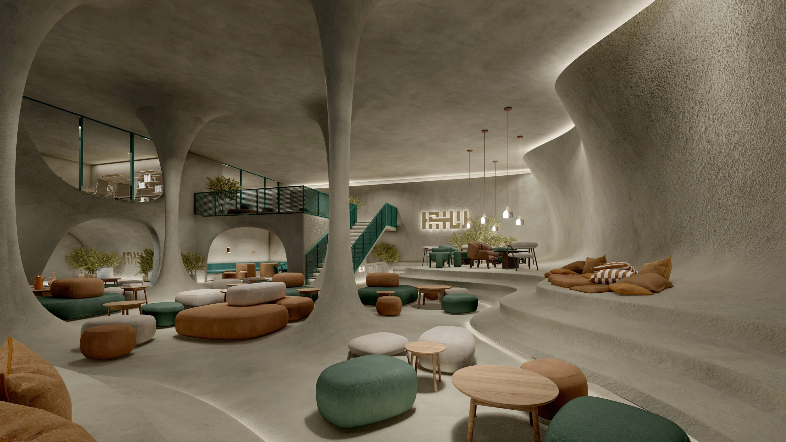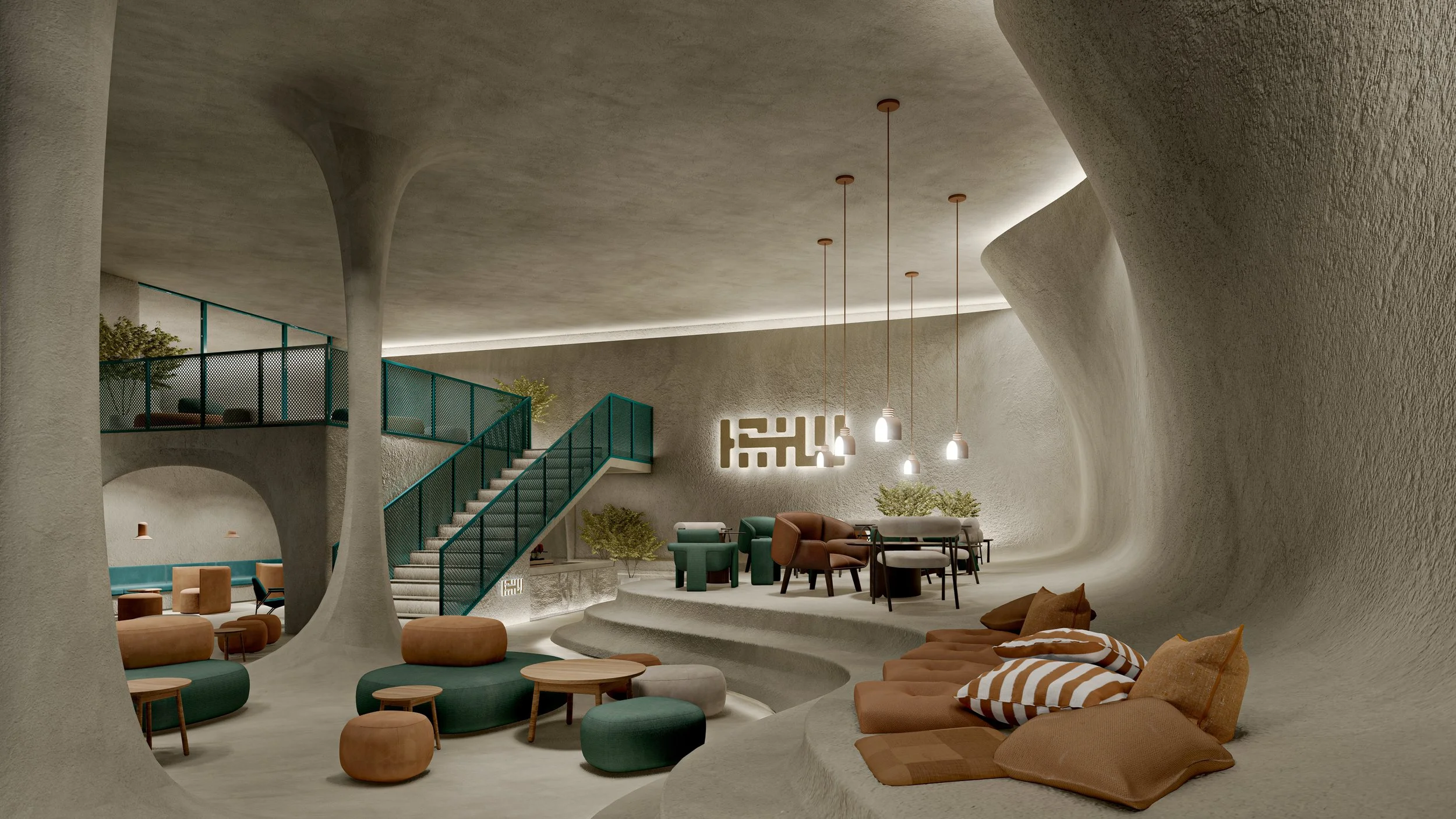 Inspired by the stunning stone formations and the intricate complexity of the UAE’s landscape elements, such as the Al Wathba Nature Reserve, incorporating these elements into the space as structural features will evoke a sense of organic natural formation.